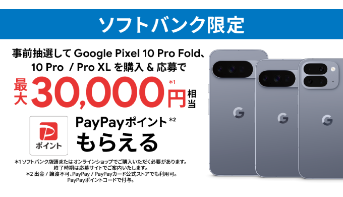 ソフトバンク または ソフトバンクオンラインショップで「Google Pixel 10 Pro Fold」「Google Pixel 10 Pro XL」「Google Pixel 10 Pro」いずれかを購入して応募すると、PayPayポイント最大30,000円相当がもらえる