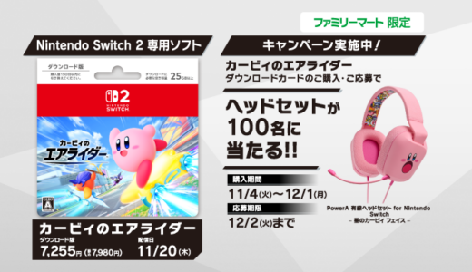 ファミリーマートにて、キャンペーン期間中にニンテンドープリペイドカード 9,000円券またはNintendo Switch Online利用券(12ヶ月券)を購入後、特設サイトより応募すると、ご購入商品に合わせてもれなく特典コードがもらえるキャンペーンを実施中!