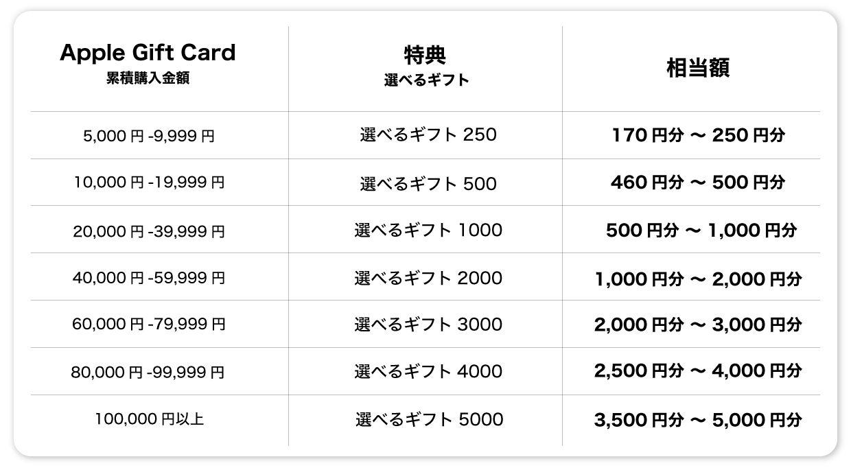 ※購入いただいた Apple Gift Card の返品・返金・交換はいたしかねますが、万が一 Apple Gift Card を返品された場合は特典付与の対象となりません。
