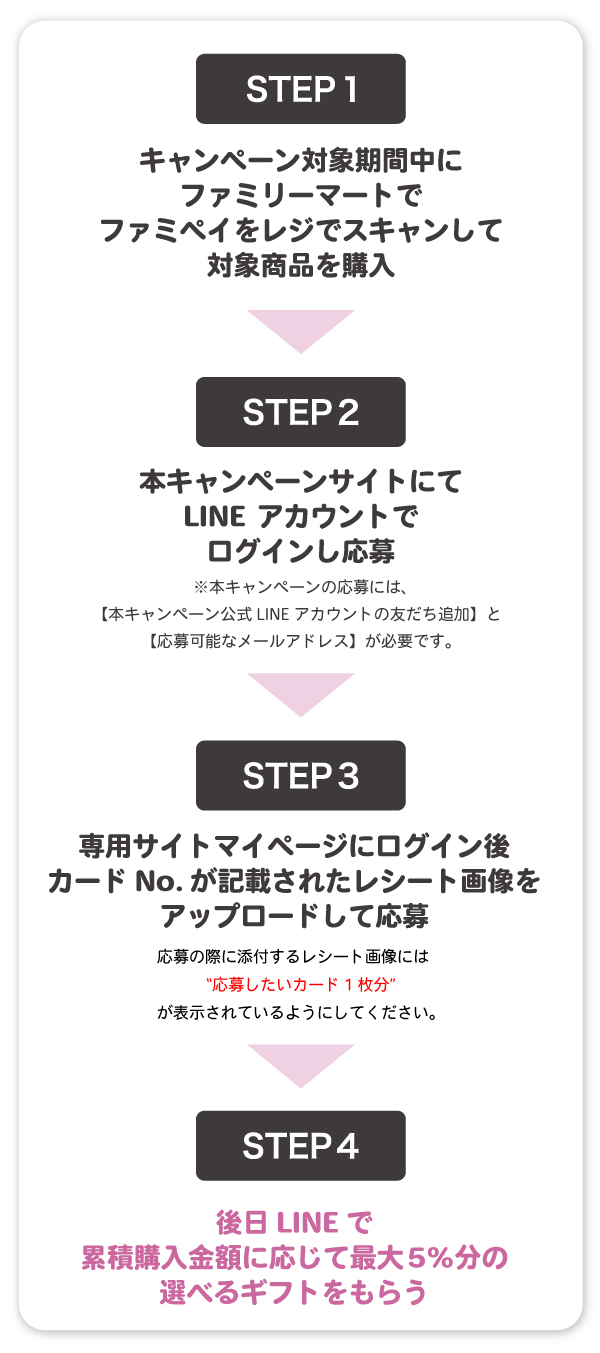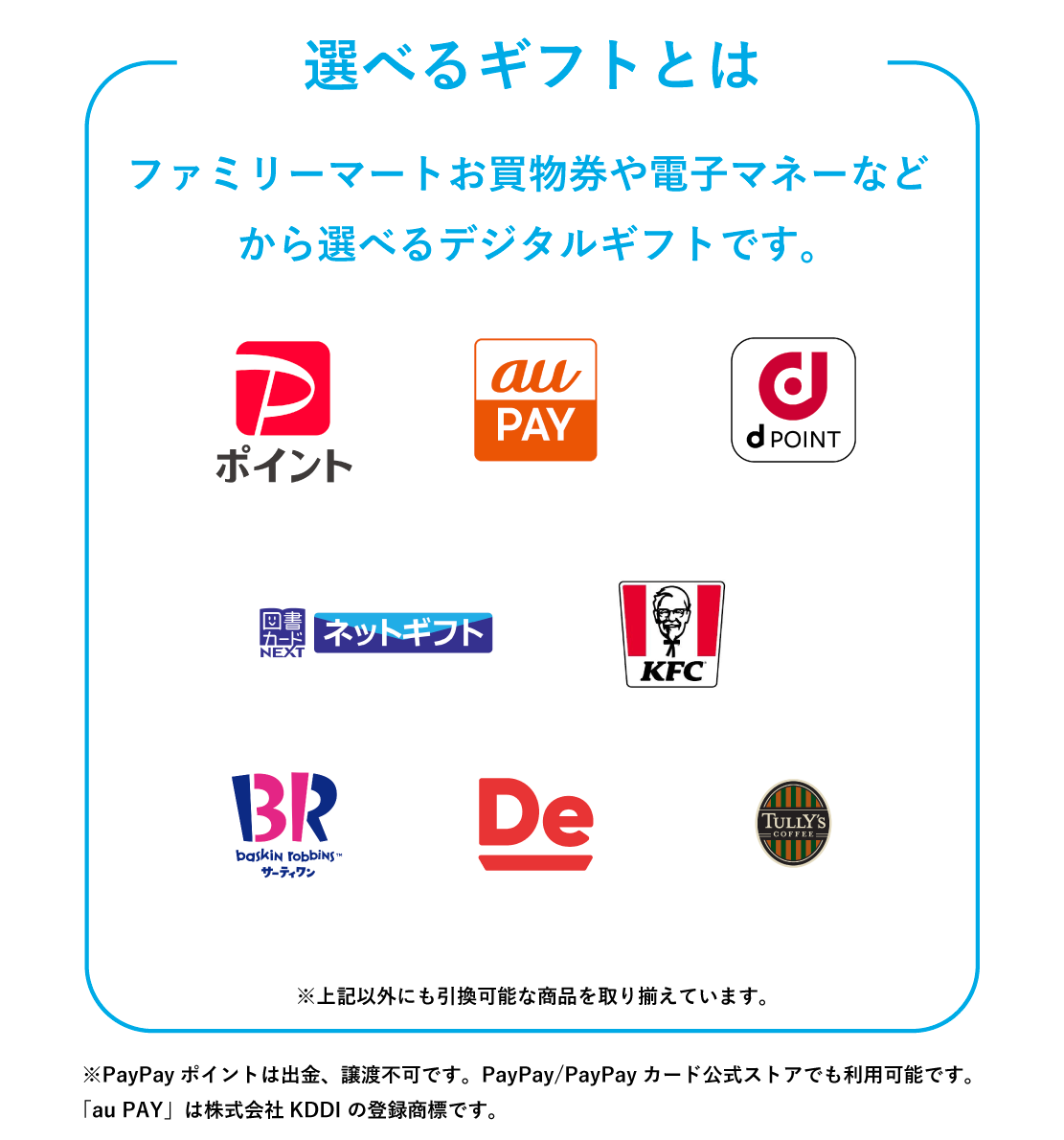期間中に、全国のファミリーマートで取り扱っている『Apple Gift Card』を購入し、購入したレシートで応募・購入金額を累積いただくと、もれなく累積金額に応じて最大5%分の選べるギフトがもらえる!