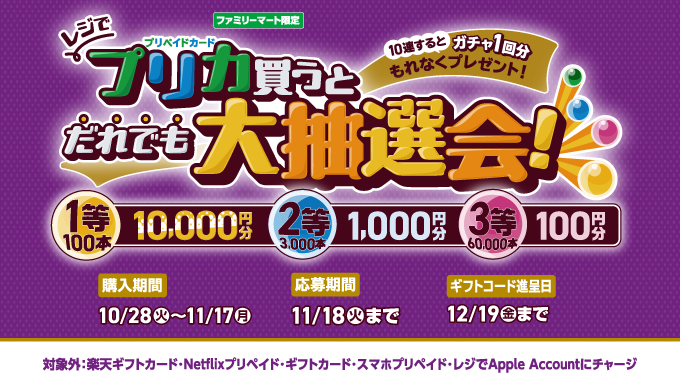 ※「楽天ギフトカード」「Netflixプリペイド・ギフトカード」「スマホプリペイド」「レジでApple Accountにチャージ」「マルチコピー機でご購入いただけるプリペイドの商品」は対象となりません。