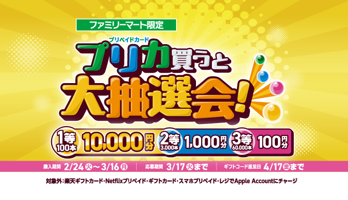 ※「楽天ギフトカード」「Netflixプリペイド・ギフトカード」「スマホプリペイド」「レジでApple Accountにチャージ」「マルチコピー機でご購入いただけるプリペイドの商品」は対象となりません。