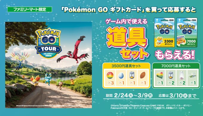 [Pokémon GO ギフトカード] ファミリーマート限定!対象商品をご購入・ご応募でゲーム内で使える「道具セット」をもれなくプレゼント!|2026年3月9日(月)まで