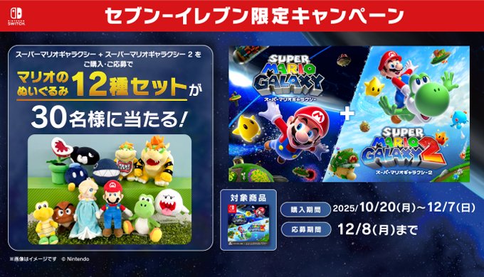 キャンペーン期間中に、セブン‐イレブン各店舗にて『スーパーマリオギャラクシー+スーパーマリオギャラクシー2』ダウンロードカードをご購入後、本特設サイトからご応募いただくと、『マリオのぬいぐるみ12種セット』 を抽選で30名様にプレゼント!