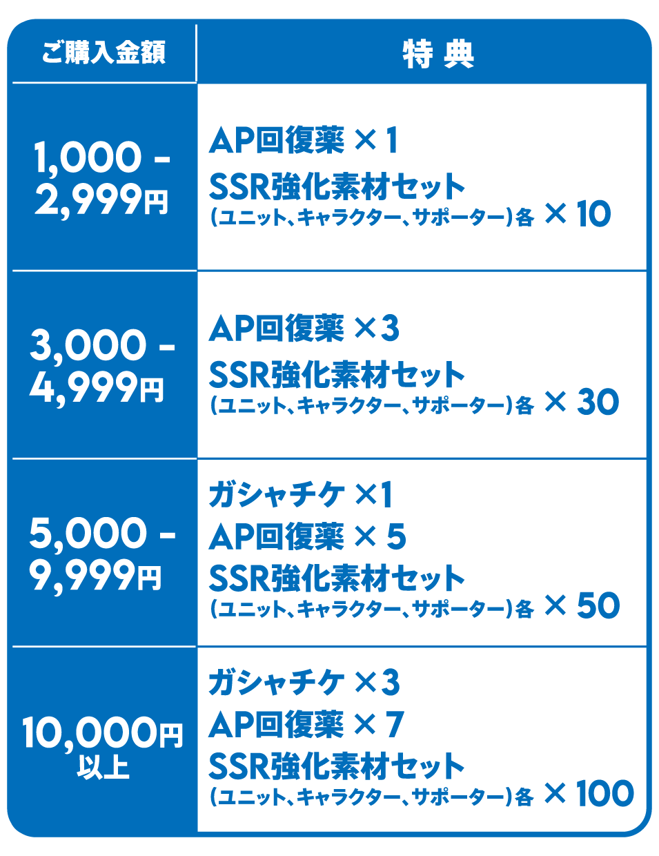 SDガンダム ジージェネレーション エターナル の 特典は、累計 1,000 円〜 2,999 円の応募でAP回復薬× 1 とSSR強化素材セット(ユニット、キャラクター、サポーター)各 × 10 を、累計 3,000 円〜 4,999 円の応募でAP回復薬× 3 とSSR強化素材セット(ユニット、キャラクター、サポーター)各 × 30 を、累計 5,000 円〜 9,999 円の応募でガシャチケ× 1 とAP回復薬× 5 とSSR強化素材セット(ユニット、キャラクター、サポーター)各 × 50 を、累計 10,000 円以上でガシャチケ× 3 とAP回復薬× 7 とSSR強化素材セット(ユニット、キャラクター、サポーター)各 × 100 をプレゼントします。