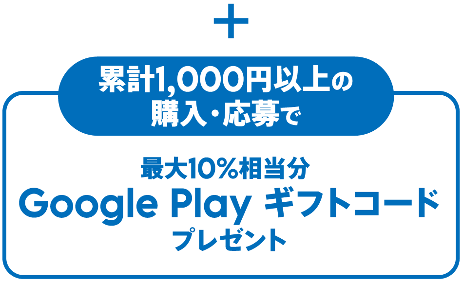 Google Play ギフトコードは、累計応募金額 1,000 円以上を対象として、その後は 1,000 円を一口として、最大 10 %分相当の Google Play ギフトコードをプレゼントします。 累計応募金額上限は 25 万円までです。最小単位は 100 円分相当で、100 円未満は切り捨てとなります。