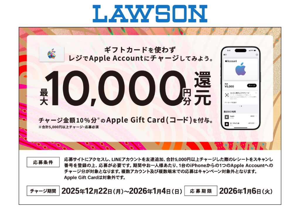 [Apple Account]ローソン限定! Apple Accountへチャージし応募でチャージ金額の10%分のApple Gift Card(コード)プレゼントキャンペーン | 2026年1月4日(日)まで