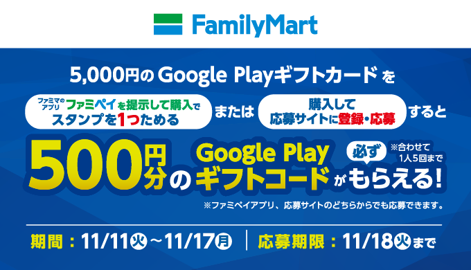 ファミリーマートにて、キャンペーン期間中に Google Play ギフトカード 5,000円券を購入して特設サイトより応募すると、もれなく500円分の Google Play ギフトコードがもらえるキャンペーンを実施中!