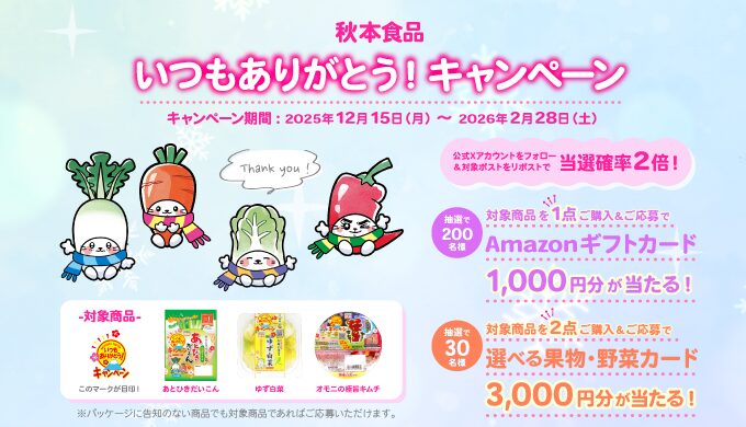 「秋本食品 あとひきだいこん・ゆず白菜・オモニの極旨キムチ」のお買い上げレシートが対象です。