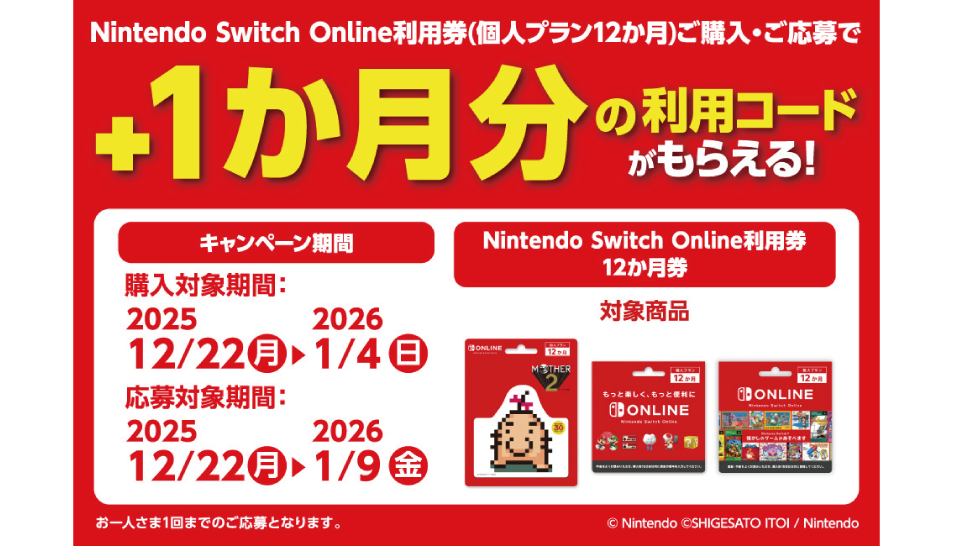 期間中に、ローソン・ナチュラルローソン・ローソンストア100にてNintendo Switch Online利用券(12ヶ月券)をご購入後、専用ウェブサイトからご応募いただくと、もれなくNintendo Switch Online 1カ月(30日間)利用コードをプレゼント!