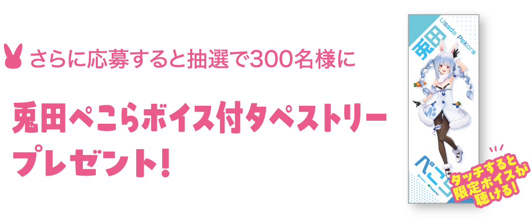さらに、特設サイトからご応募登いただくと、抽選で300名様に兎田ぺこらボイス付タペストリーが当たるキャンペーンを実施中!