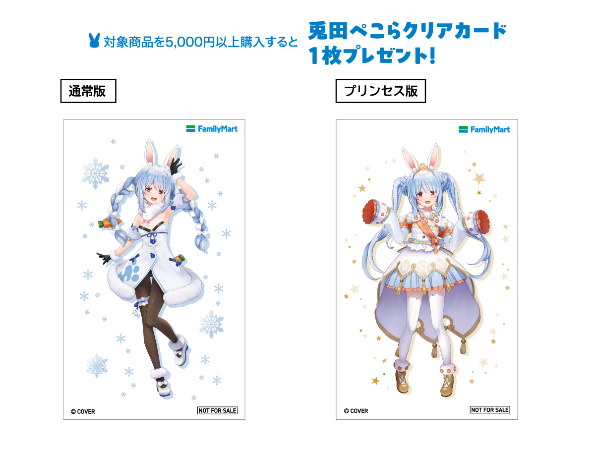 ファミリーマートにて、キャンペーン期間中にApple Gift Card または Google Play ギフトカード いずれかを5,000円以上ご購入いただくと、兎田ぺこらクリアカード1枚プレゼント!(店舗にて配布、無くなり次第終了)